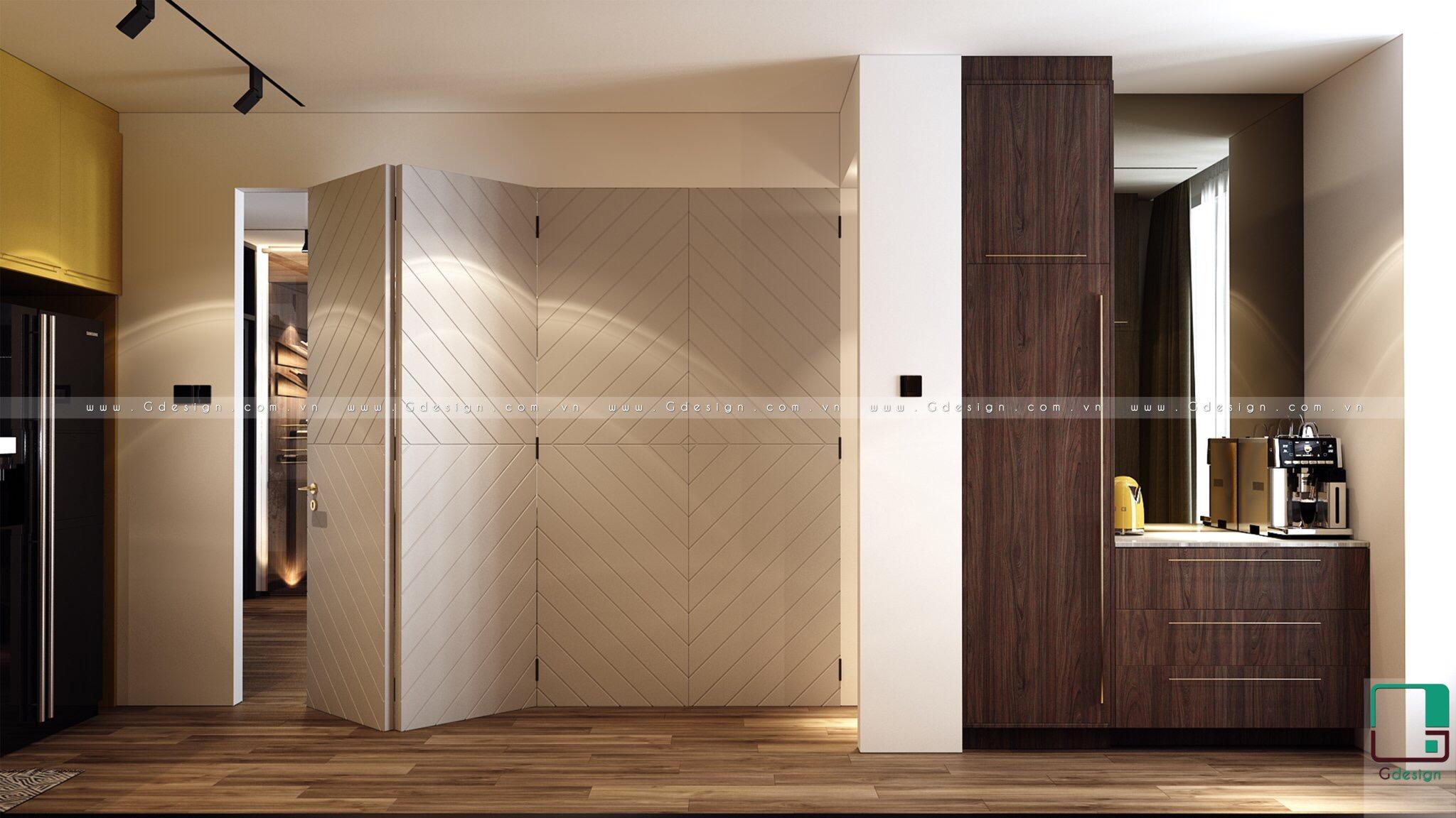 Cửa ngăn cách phòng được làm dạng gấp để tránh việc chiếm dụng diện tích lối đi lại trong phòng. Kế sát bên khung cửa sổ, các KTS đã gợi ý kê thêm bộ tủ tường nhỏ để gia chủ có thêm nơi thư giãn, pha cafe và ngắm nhìn quang cảnh bên ngoài.