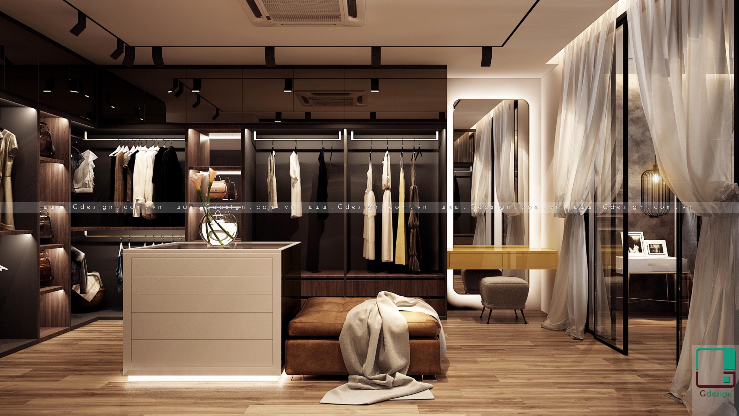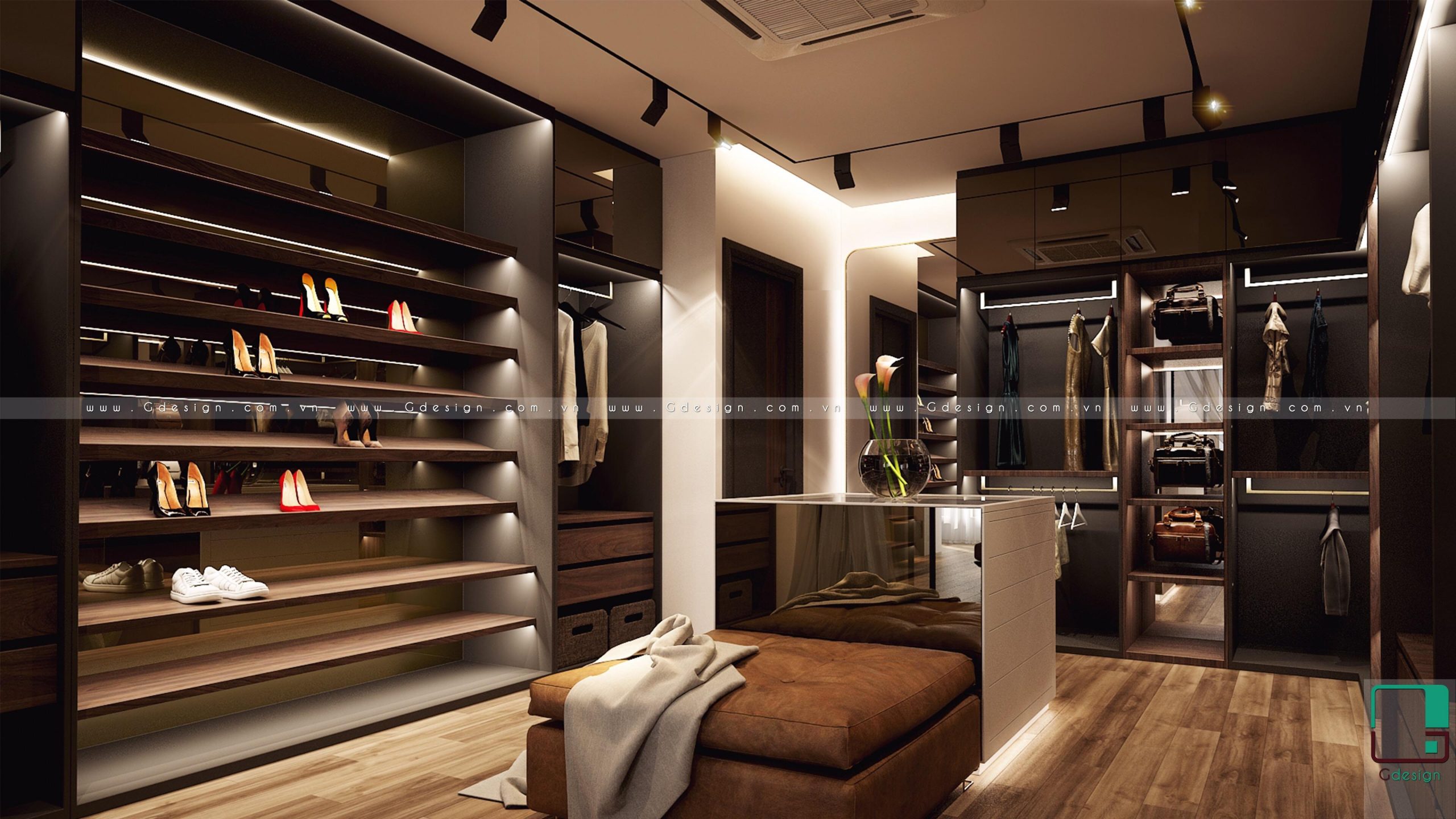 Phòng thay quần áo phân chia thành các khu vực để đồ treo, đồ xếp và các phụ kiện thời trang sử dụng hằng ngày. Hệ đèn led cảm ứng tôn lên vẻ đẹp & sang trọng của hệ tủ. Giúp mọi người thuận tiện khi thao tác mà không cần sử dụng nhiều đến công tắc điện.